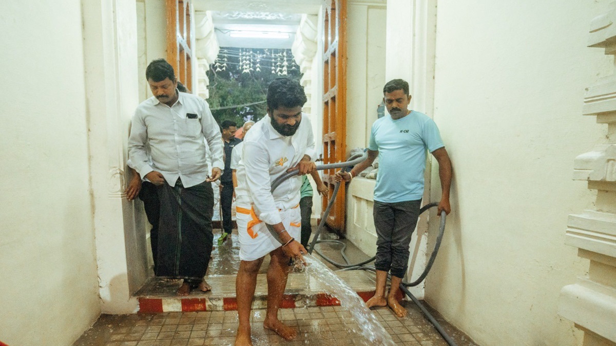 तमिलनाडु भाजपा अध्यक्ष के अन्नामलाई ने हाथ में पानी का पाइप लेकर मंदिर प्रांगण की सफाई की। इसका वीडियो भी सामने आया है। इस दौरान वह हाथों से रगड़-रगड़कर मंदिर की सफाई करते दिखे।